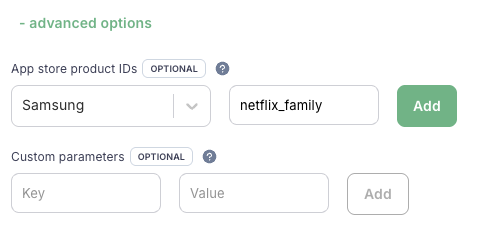 vii. Click Add and then click Finish editing when ready. Done! Your Cleeng offer is now linked to the Samsung-TV product. Whenever the connector receives notifications about subscriptions with this specific Samsung-TV product ID, Cleeng will associate those subscriptions with this specific Cleeng offer.